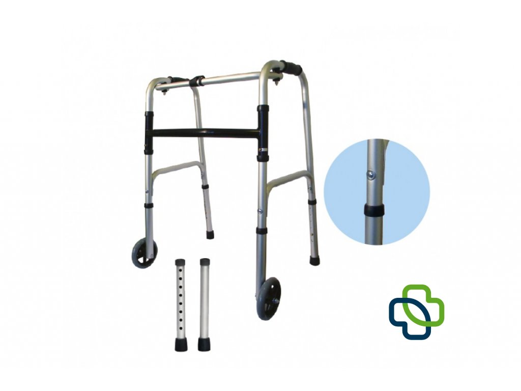 Lehký a pevný skládací rám má nosnost 136 kg. Madla jsou vyrobena z materiálu elastamer, který je příjemný na držení. Chodítko je jednoduché na výškové nastavení a skládání, a je vybaveno protiskluzovými gumovými nástavci. Barva stříbrná.