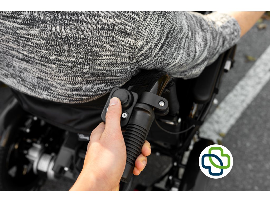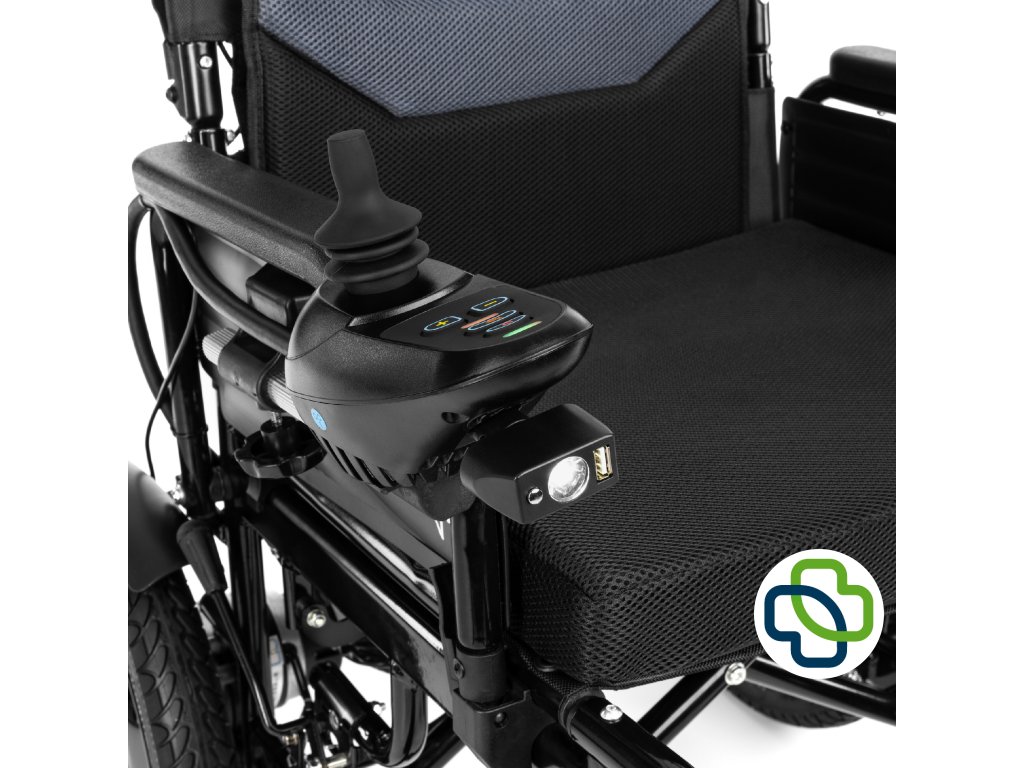 Ovládací modul: tlačítko zapnutí/vypnutí, podsvícení tlačítek, univerzální joystick, klakson, tlačítka pro regulaci rychlosti, ukazatel stavu baterie
