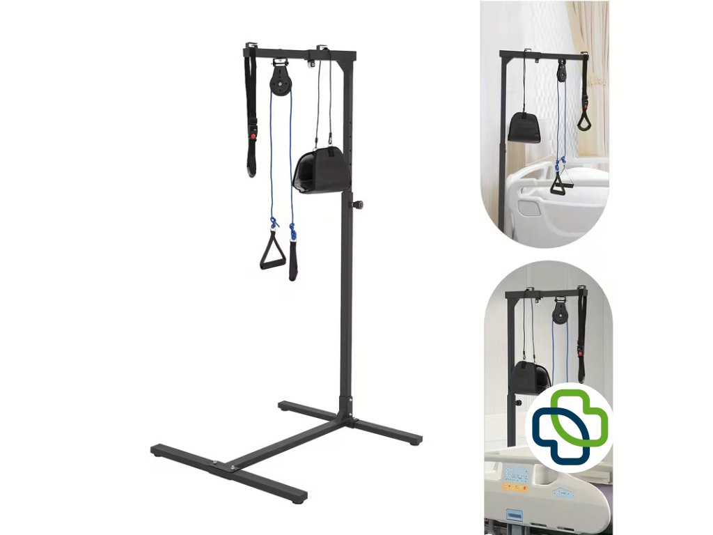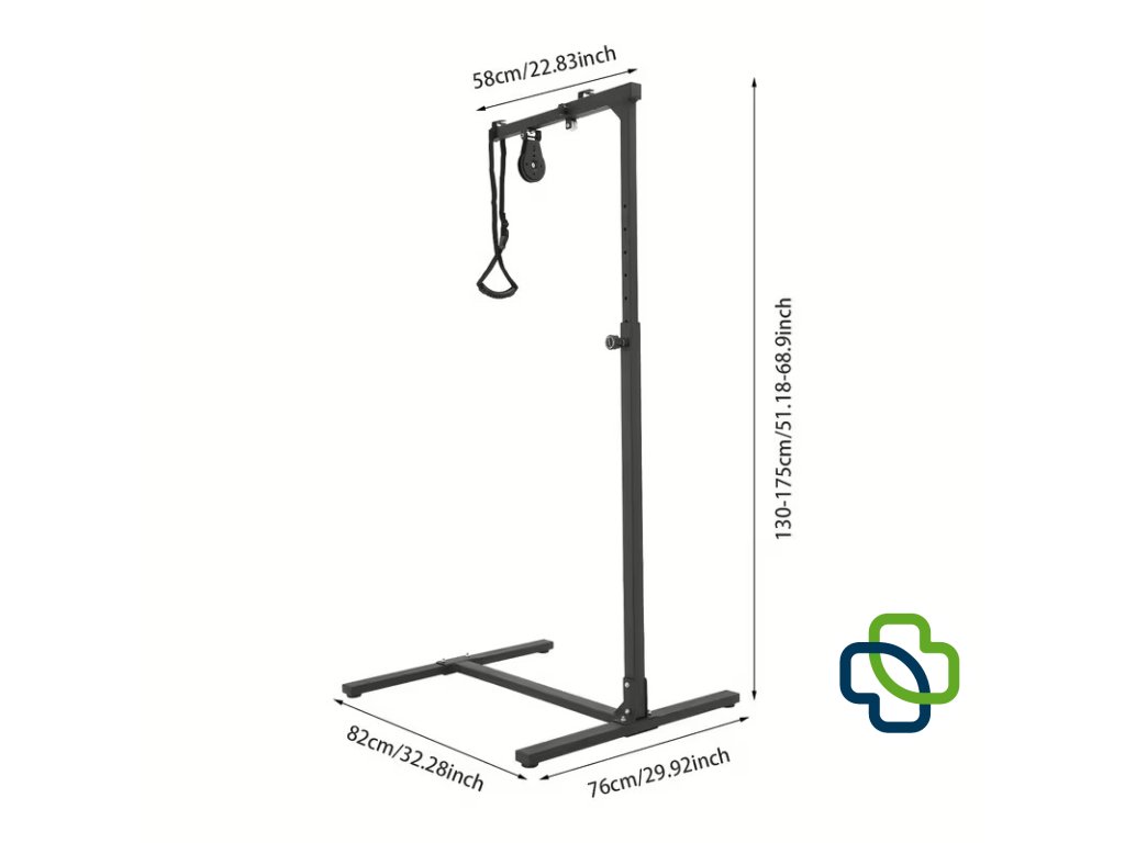 Stojací rám s trapezoovou tyčí pro podporu vstávání a mobilitu na lůžku. Nabízí 9 úrovní výškového nastavení, protiskluzovou základnu, 360° otočné kolečko, pevnou ocelovou konstrukci a nosnost 100 kg. Ideální pro seniory, těhotné ženy, osoby po operacích a uživatele s omezenou pohyblivostí. Vhodný k nemocničním i domácím postelím, k židlím i pohovkám. Umožňuje bezpečné přitahování, vstávání i rehabilitační cvičení horních končetin.